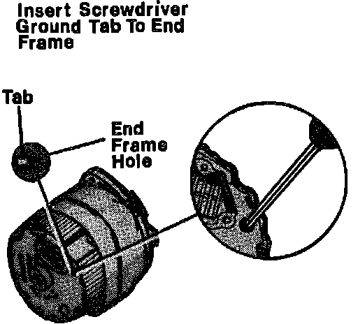 7. If ammeter reading is not within 10 amps of rated output, ground field winding by inserting screwdriver in end frame hole, contacting tab, Fig. 7. Do not insert screwdriver deeper than one inch, as tab is usually located within 3/4 inch of casing surface.