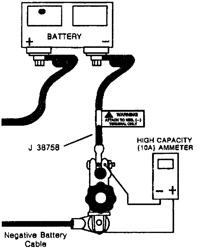 14. When the cause of the excessive current drain has been located and repaired, remove the J 387S8 and connect the battery ground (negative) cable to the battery.