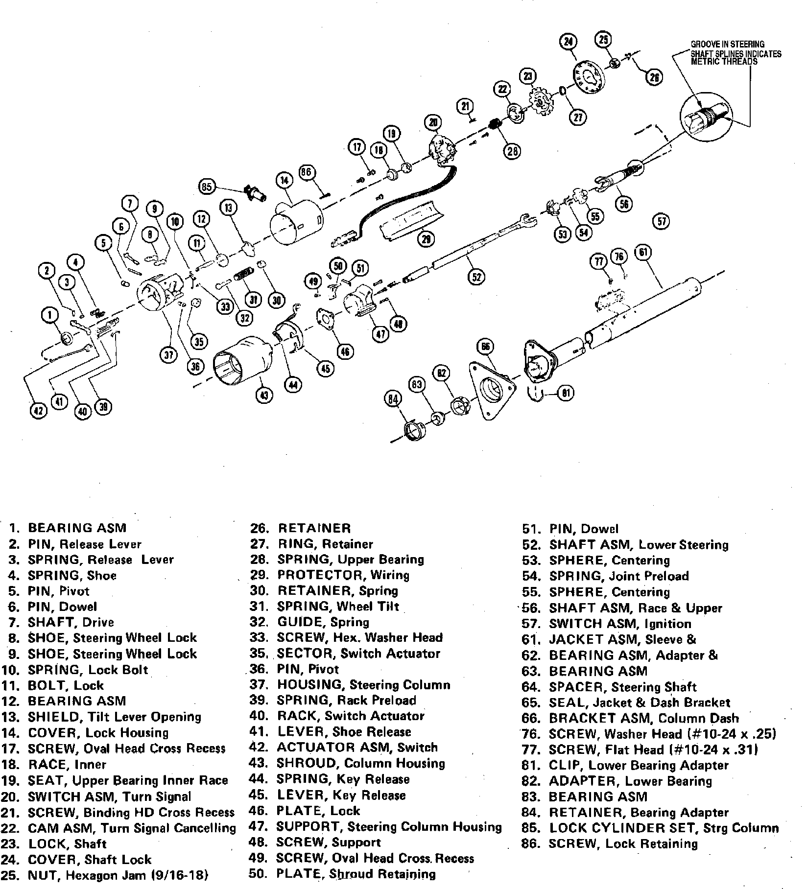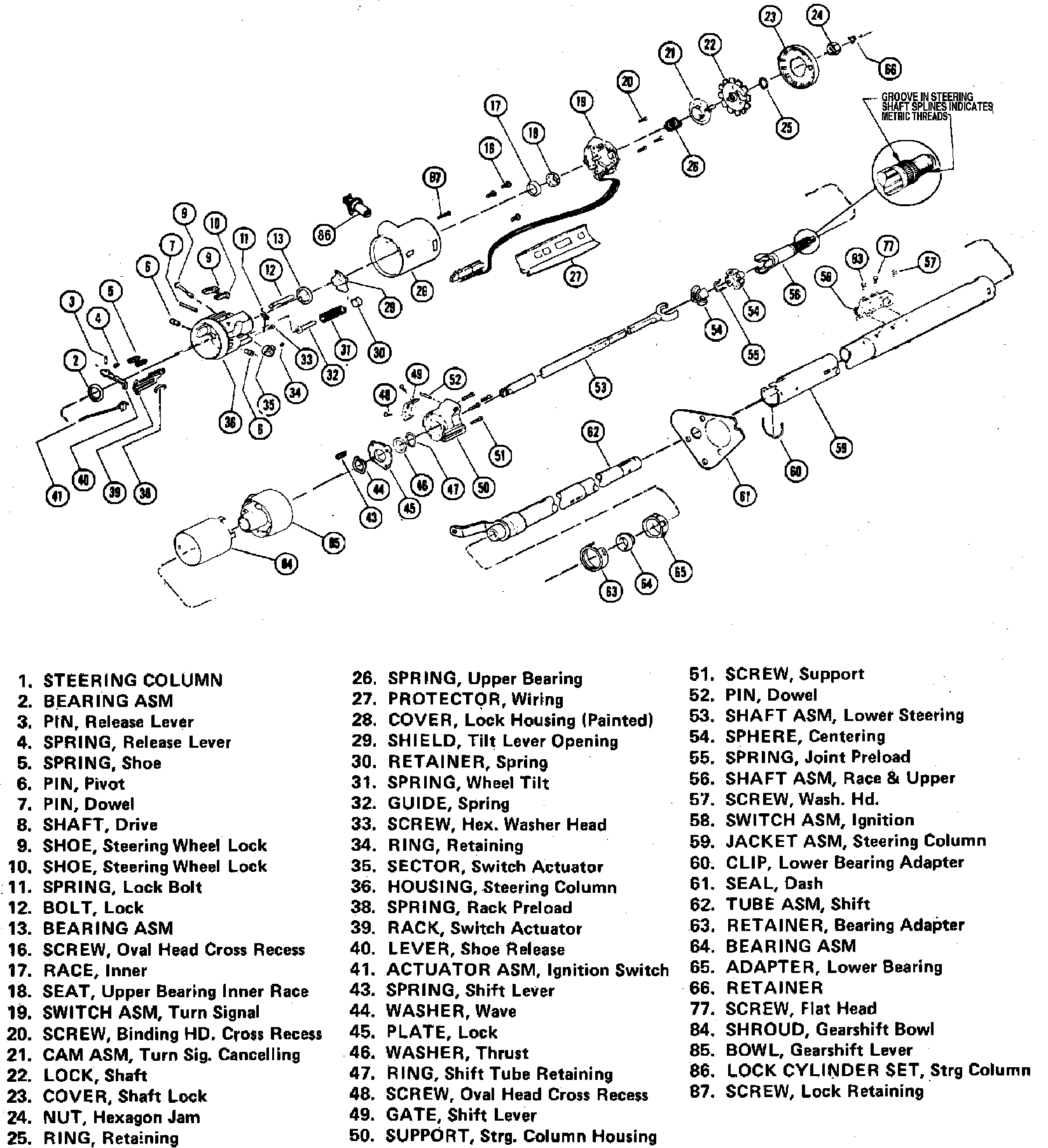 Fig. 14 Tilt steering column and components. Manual transmission, exc. Astro Van, S/T 10-15 & Safari: