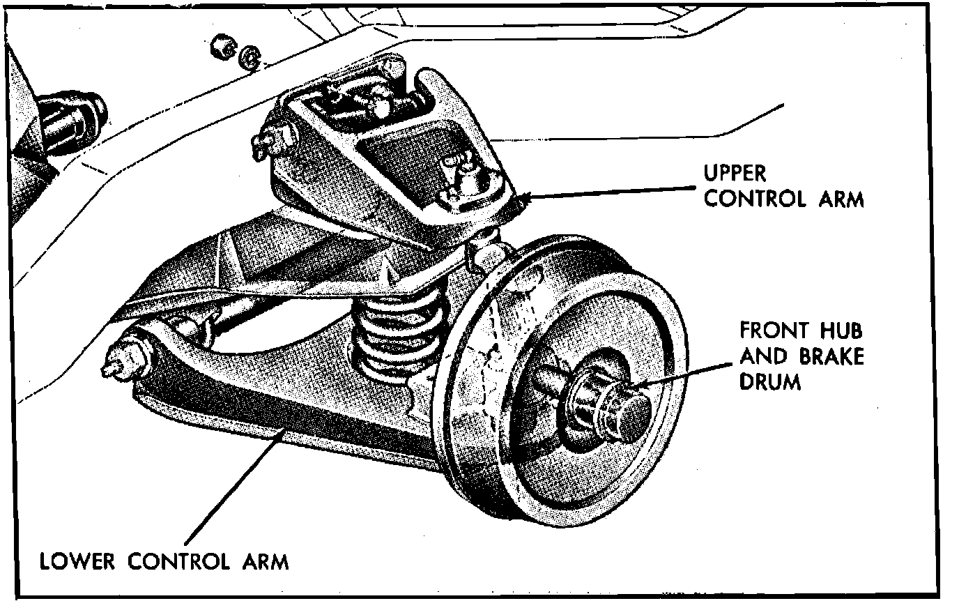 This suspension, Fig. 2, consists of upper and lower control arms pivoting on steel threaded bushings on upper and lower control arm shafts which are bolted to the front suspension crossmember and bracket assembly. These control arms are connected to the steering knuckle through pivoting ball joints. A coil spring is located between the lower control arm and a formed seat in the suspension crossmember, thus the lower control arm is the load-carrying member. The double-acting shock absorbers are also attached to the lower control arms and connect with the frame to the rear of the suspension on the upper end.