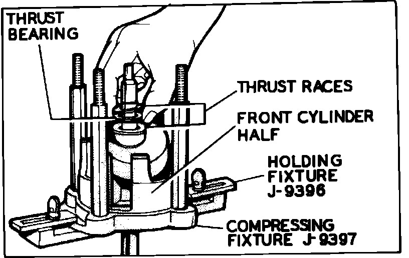 4. Insert threaded end of shaft through needle bearing in front cylinder half, and allow thrust race and bearing to rest on hub of cylinder.