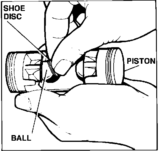 24. Remove rear cylinder half and remove one piston at a time from swash plate and front cylinder half. Do not lose relationship of front ball and shoe disc and rear ball. Transfer each piston, ball and shoe disc into proper part dish or cup.
