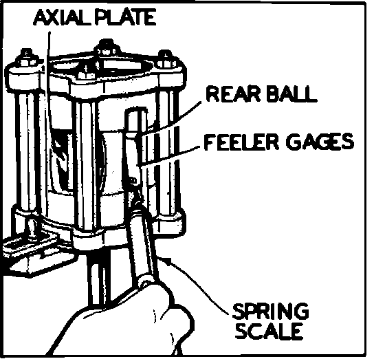 d. If reading is under 4 or over 8 ounces, reduce or increase thickness of feeler gauge leaves and repeat Steps a through c until a reading of 4 to 8 ounces is obtained. Record clearance between ball and swash plate resulting in 4 to 8 ounce pull on spring scale.
