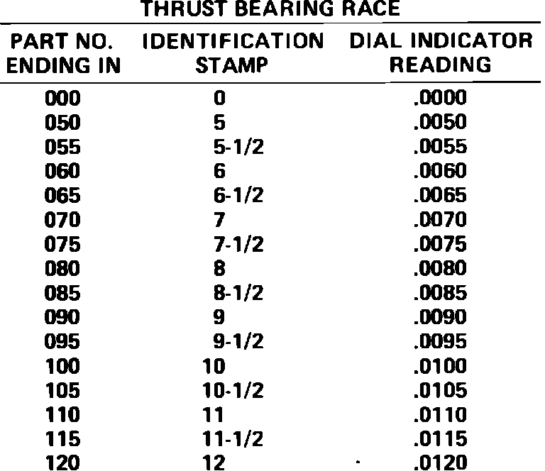 21. On compressors without Teflon piston rings, select a thrust race with a number corresponding to amount of end play shown. On compressors with Teflon piston rings, select a thrust race with a number corresponding to 2 full sizes larger than dial indicator reading or feeler gauge measurement of endplay shown. Fifteen thrust races are provided in increments of .0005 inch thickness and one zero gauge thickness, providing a total of 16 sizes available for field service, Fig. 38. Thrust races are identified partly by their thickness in thousands in excess of thickness of zero thrust race. This number also corresponds to last 3 digits of piece part number. A tolerance of .0005 inch to .0015 inch is built into thrust races to provide a running clearance between hub surfaces of swash plate and front and rear hubs of cylinder.