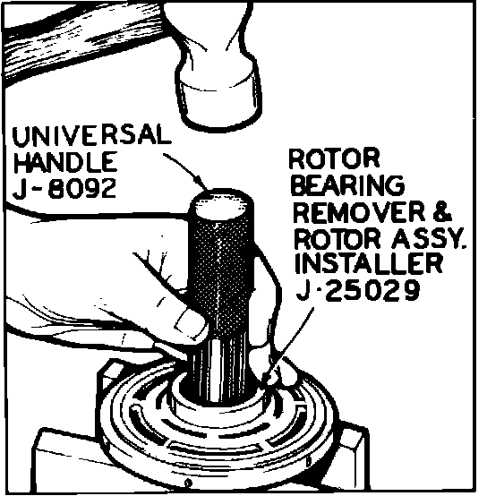2. Using tools J-8092 and J-25029 or J-9398, drive bearing from rotor hub, Fig. 11. It is not necessary to remove staking at rear of rotor hub to remove bearing.
