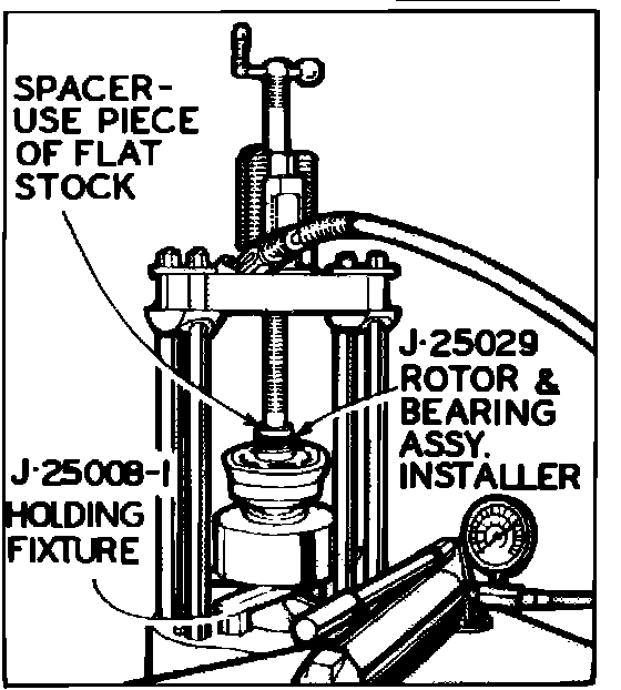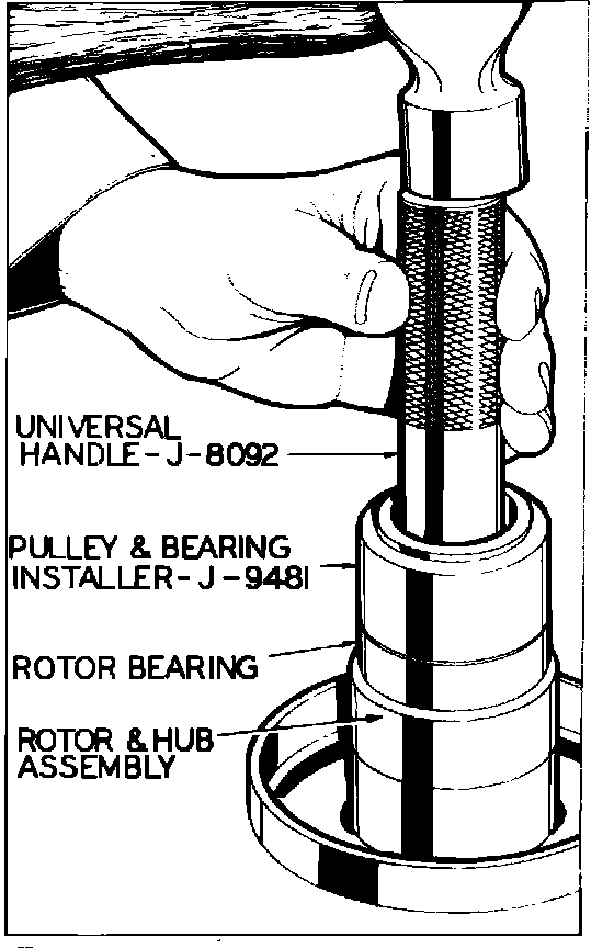 1. Using tools J-9481 and J-8092, drive rotor bearing into hub. Align bearing squarely with hub bore before attempting to drive bearing into bore, Fig. 12.
