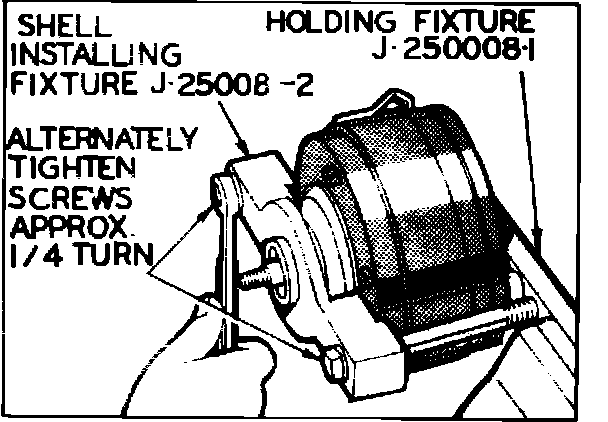4. Manually push shell close to O-ring and tighten fixture screws finger tight. Ensure shell is aligned properly, then alternately tighten fixture bolts approximately 1/4 inch to push shell over cylinder O-rings and against shell stop flange at rear of cylinder, Fig. 27.