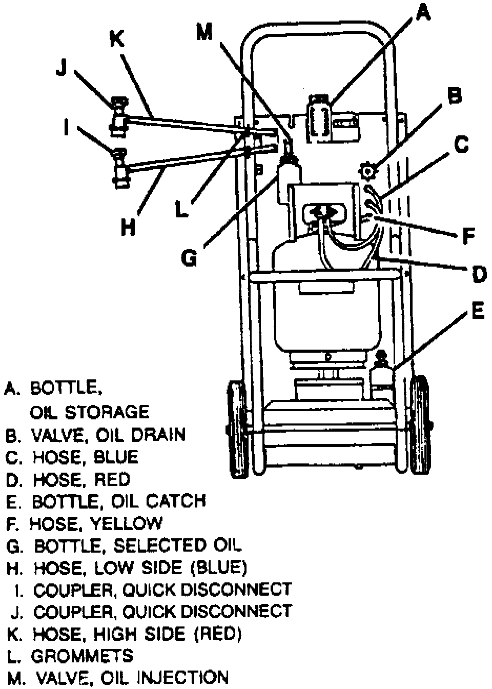 CAUTION: Some A/C lubricating oil might be removed with refrigerant during discharge. OIL/OZ. (OIL/GMS) flashing is a reminder to drain discharged oil at this time. Any oil lost must be replaced later when system is recharged with refrigerant.
