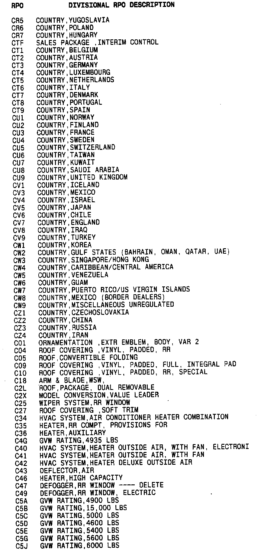 List of Regular Production Option (RPO) Codes