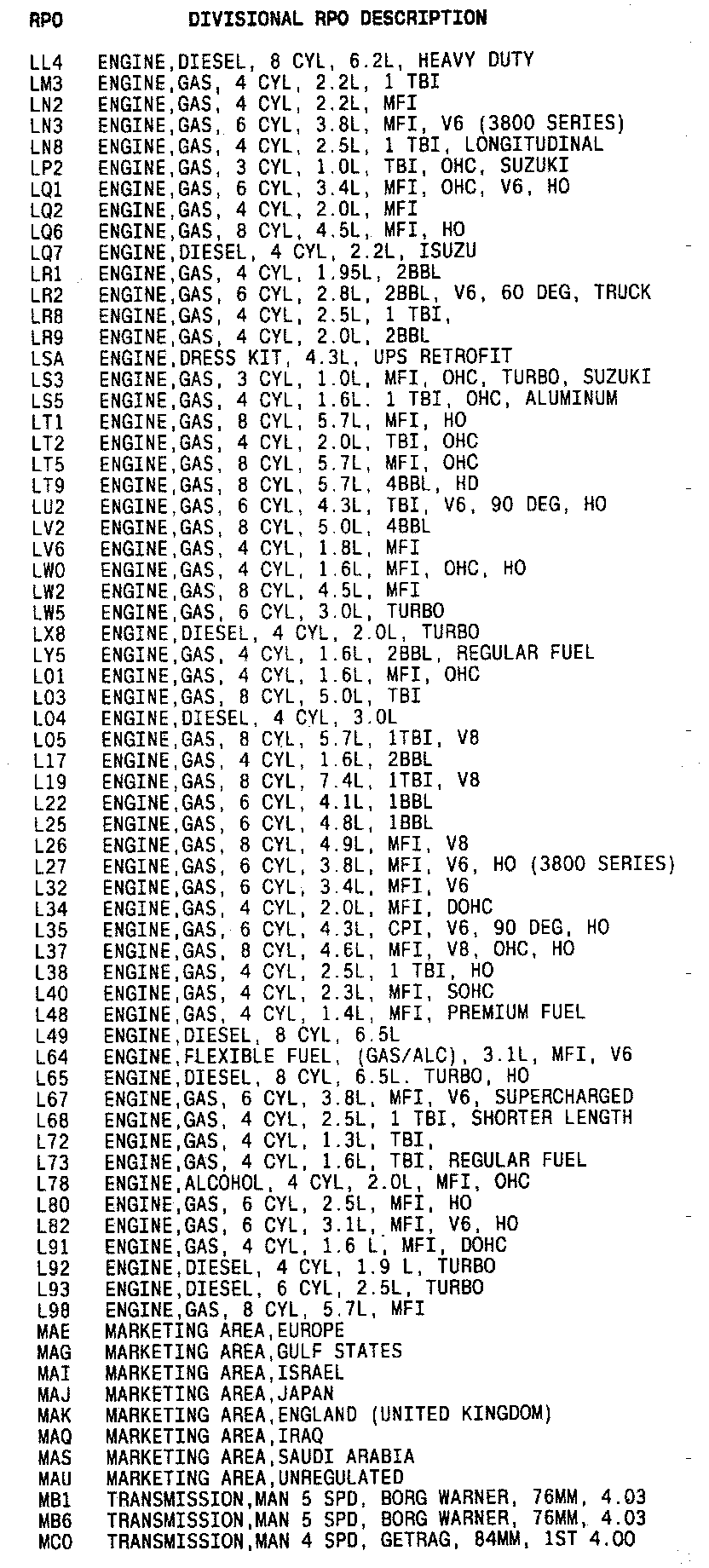 List of Regular Production Option (RPO) Codes