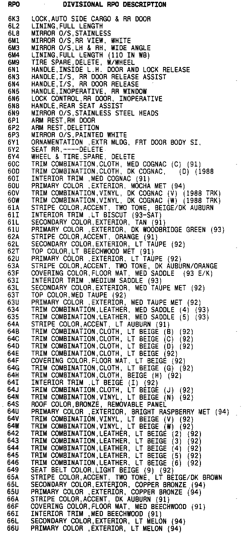 List of Regular Production Option (RPO) Codes