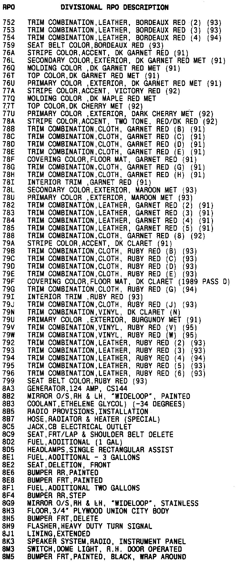 List of Regular Production Option (RPO) Codes