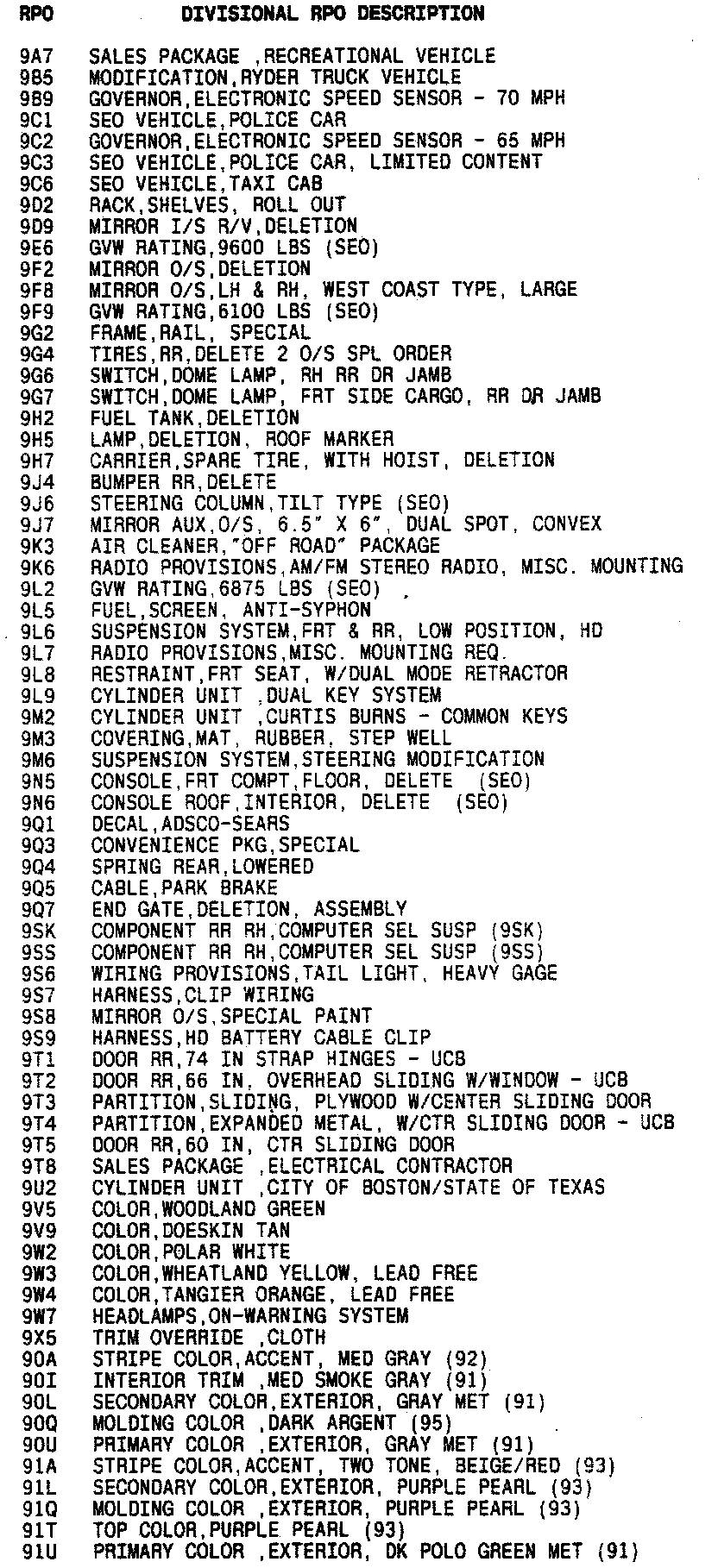 List of Regular Production Option (RPO) Codes