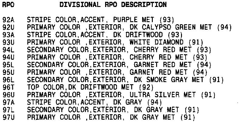 RPO Codes: 92A-97U