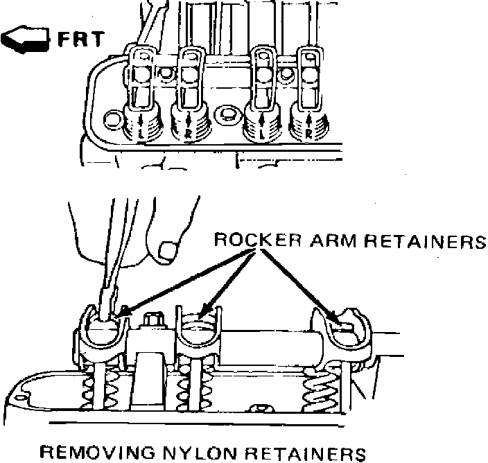 b. Remove tops of retainers, Fig. 15, then remove rockers, noting position for installation.
