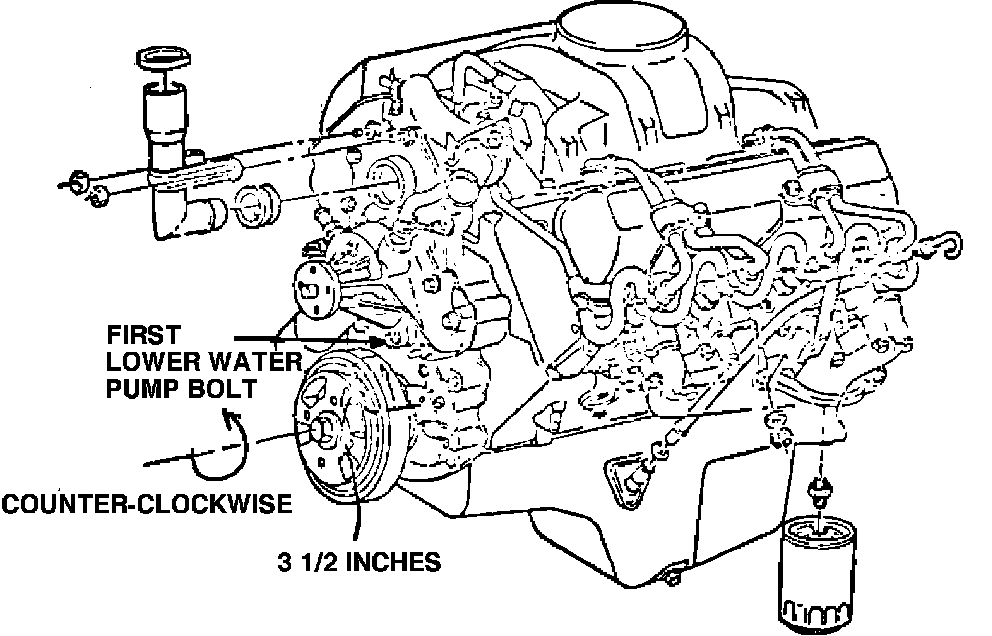 9. Before installing rocker arm shafts, align TDC mark on engine with mark on engine balancer, then rotate crankshaft 31/2 inches counterclockwise, or to first lower water pump bolt, Fig. 16. This will position engine so that all valves are closed. Torque rocker arm shaft bolts to specifications, tightening bolts slowly to allow lifters to bleed down. The rocker arm shaft must be installed with the split in the ring around the shaft at bottom.