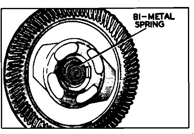 There are two types of fan drive clutches in use, one with a flat bimetallic thermostatic spring, Fig. 2, and the second with a coiled bimetallic thermostatic spring, Fig. 3.