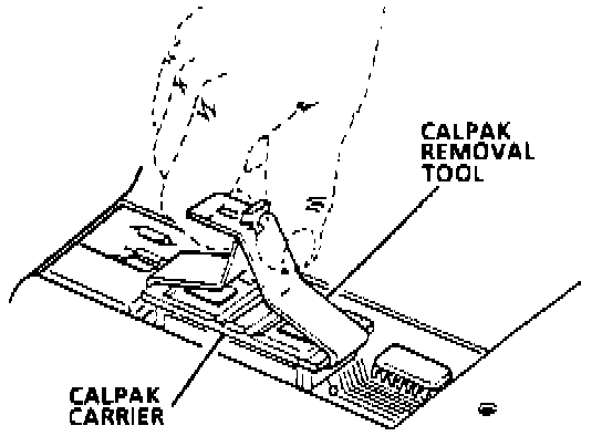 3. Remove Calibration Pack (CALPAK) using removal tool shown. Grasp the CALPAK carrier on the narrow ends only. Gently rock the carrier from end to end while applying a firm upward force.