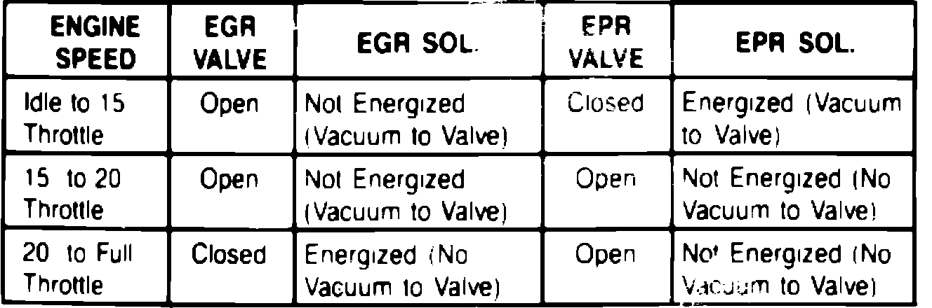 The EGR/EPR assembly controls EGR and EPR valve operation by regulating operating vacuum supplied by the vacuum pump. The assembly consists of an EGR vent solenoid which acts as a vacuum bleed in the EGR valve circuit, and a normally closed EPR solenoid valve. Energized, the EGR solenoid vents EGR operating vacuum to atmosphere, and the EPR solenoid opens to provide EPR valve operating vacuum. The ECM energizes the EPR solenoid only at idle, and controls EGR valve operation by varying the ``on'' and ``off'' time of the EGR solenoid.