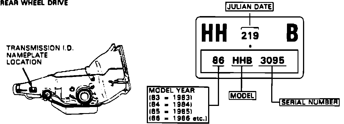 The transmission identification tag or stamped identification contains such information as transmission type, model year, model, serial number, and Julian date.