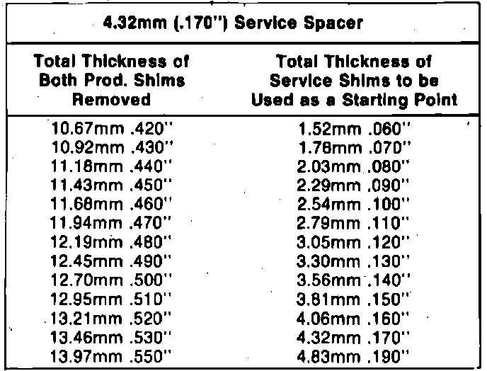 3. In addition to .170 inch service spacers for each side, refer to chart, Fig. 13, and select service shim thickness required based on measurements made in step 2.