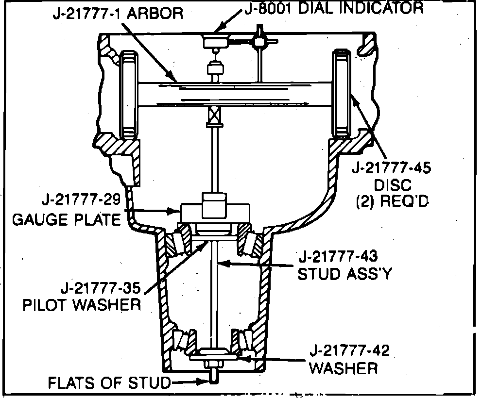 3. Mount depth gauging jig in housing noting the following. Use gauge assembly J-23597-01 for models with 7-1/2 inch ring gear, J-21777-01 for models with 8-1/2 or 8-7/8 inch ring gear, Figs. 16 and 17, or suitable equivalents. On models with 8-7/8 inch ring gear, substitute cloverleaf gauge plate J-21777-36 for plate J-21777-29. Follow all tool manufacturer's recommendations when installing gauge assembly.