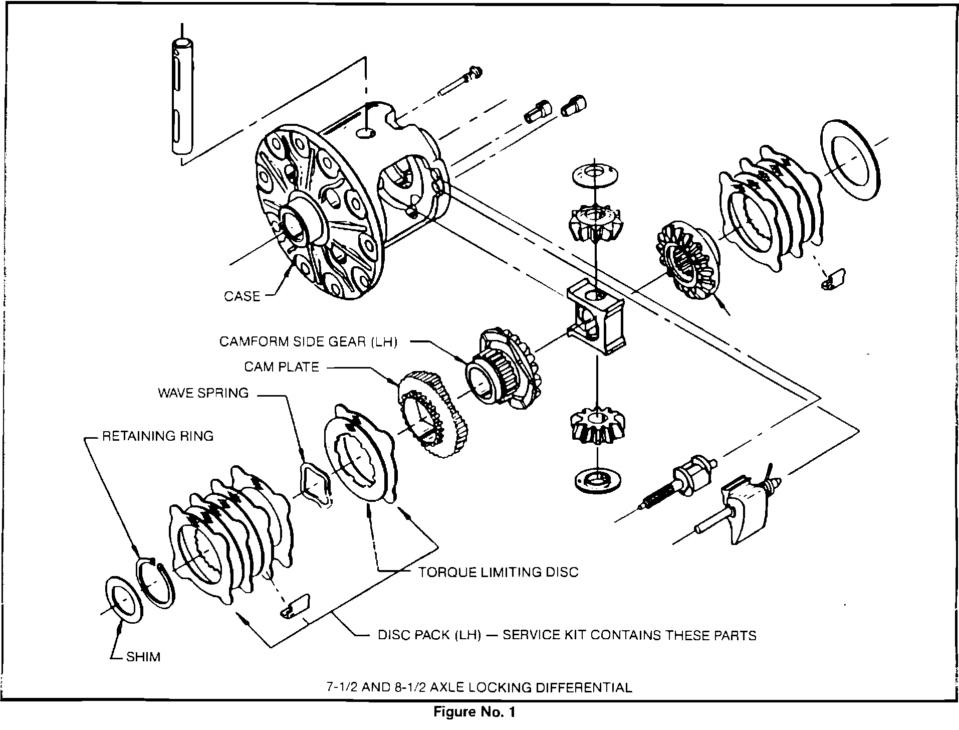Starting in 1986, the 7-1/2 inch, 8-1/2 inch, and 9-1/2 inch Eaton locking differential design includes a load limiting feature to reduce the chances of damaging an axle shaft under high torque engagement conditions. The number of tangs on the inner most disc of the left hand clutch pack has been reduced, allowing these tangs to shear in the event of a high torque engagement of the locker. See Figures No. 1 and No. 2. When the tangs shear, the lock mechanism is disengaged, thus limiting the torque transmitted to the axle shafts.