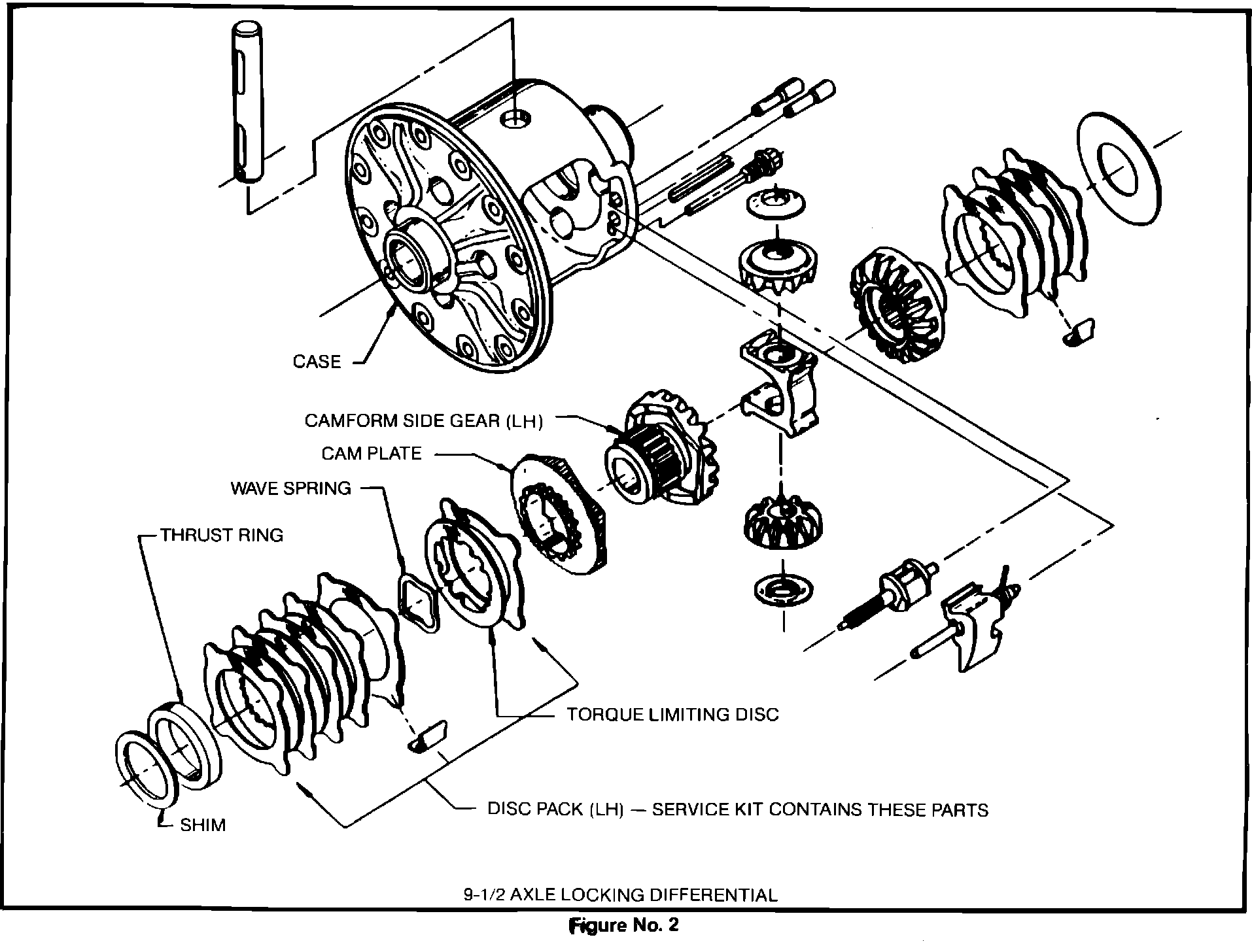 In the event the load limiting disc shears, the differential will continue to operate essentially as an open differential with some limited slip action of the clutch packs at low torques. No additional damage should occur to the differential while driving with a sheared load limiting disc. When the tangs shear, the metal is trapped by the splines of the cam plate, thus preventing further damage to the differential. Implementation of the new Eaton locking differential occurred with the following axle assembly date codes: