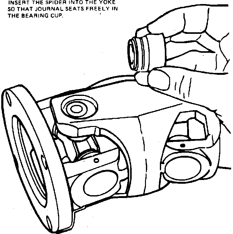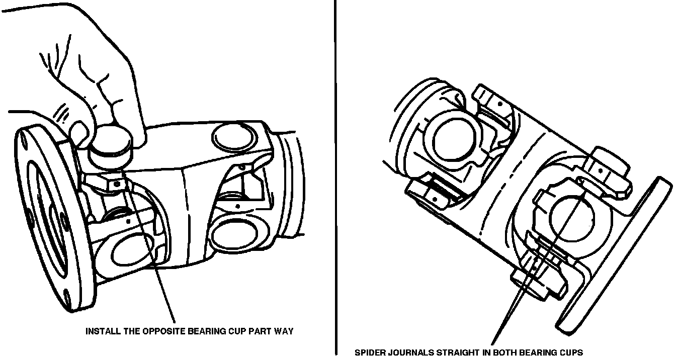 3. Press bearing cups, while moving cross to ensure free movement of trunnions in bearing. If any binding is felt, stop pressing and check needle bearings to make sure that needle bearings have not been trapped under the ends of the cross journals.