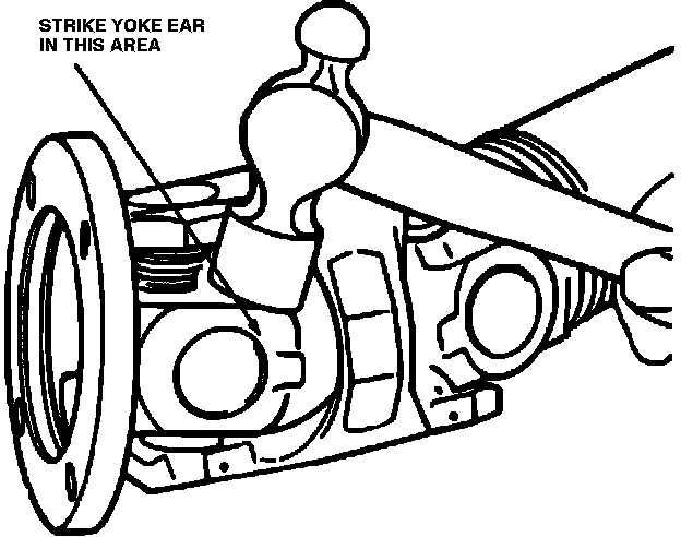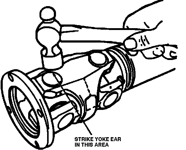 5. Continue to press until opposite retaining ring can be snapped into place. If difficulty is encountered, strike the yoke firmly in locations shown in Figs. 20, 21 and 22, to spring the yoke ears slightly.