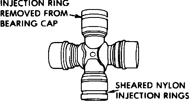 Some driveshafts use an injected nylon retainer on the universal joint bearings. When service is necessary, pressing the bearings out will sheer the nylon retainer, Fig. 1. Replacement with the conventional steel snap ring type is then necessary, Fig. 2.