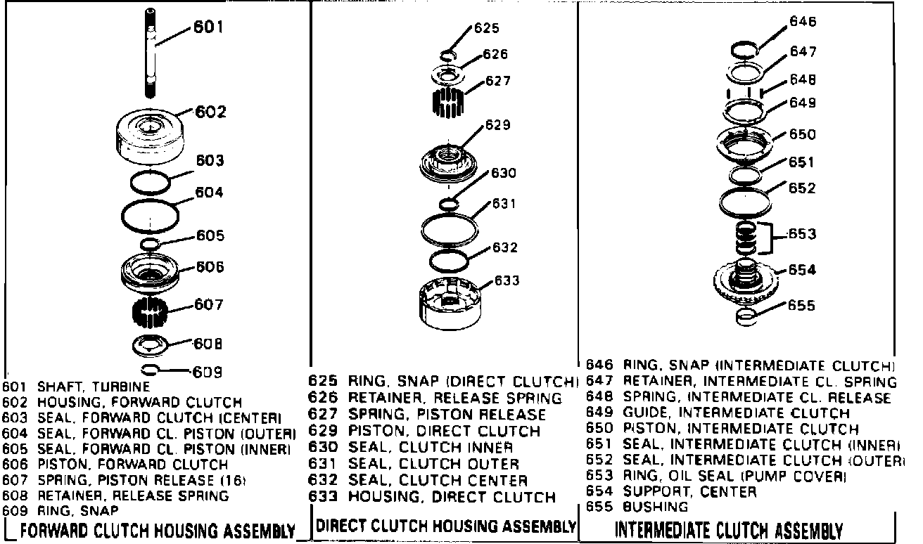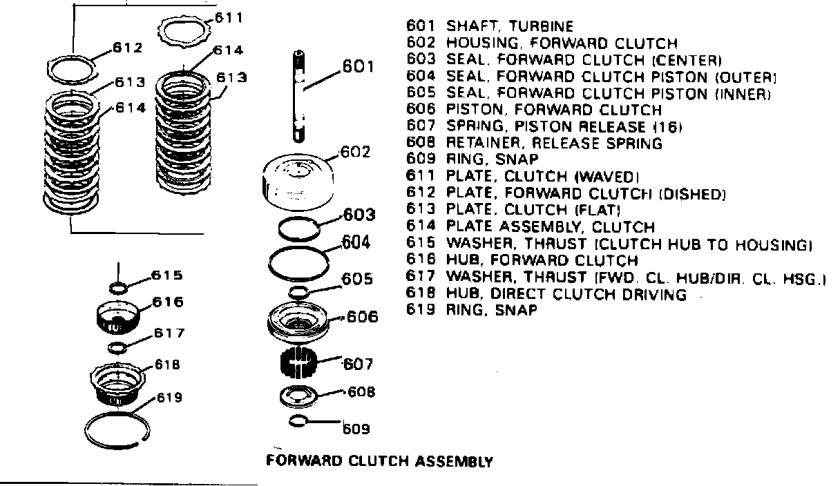 With the introduction of belleville plates, (used with the Neutral/Drive garage shift package, referenced in dealer service bulletin 88-19 (Section 7A), the THM 400/475 forward clutch is manufactured with two distinct clutch assemblies depending on the cushion plate used. When the piston is followed by a dished (belleville) plate (612), the dished plate is followed by a steel plate and then alternate with composition plates to complete the assembly. When the piston is followed by a waved plate (611), the waved plate is followed by a composition plate and then alternate with steel plates to complete the assembly.