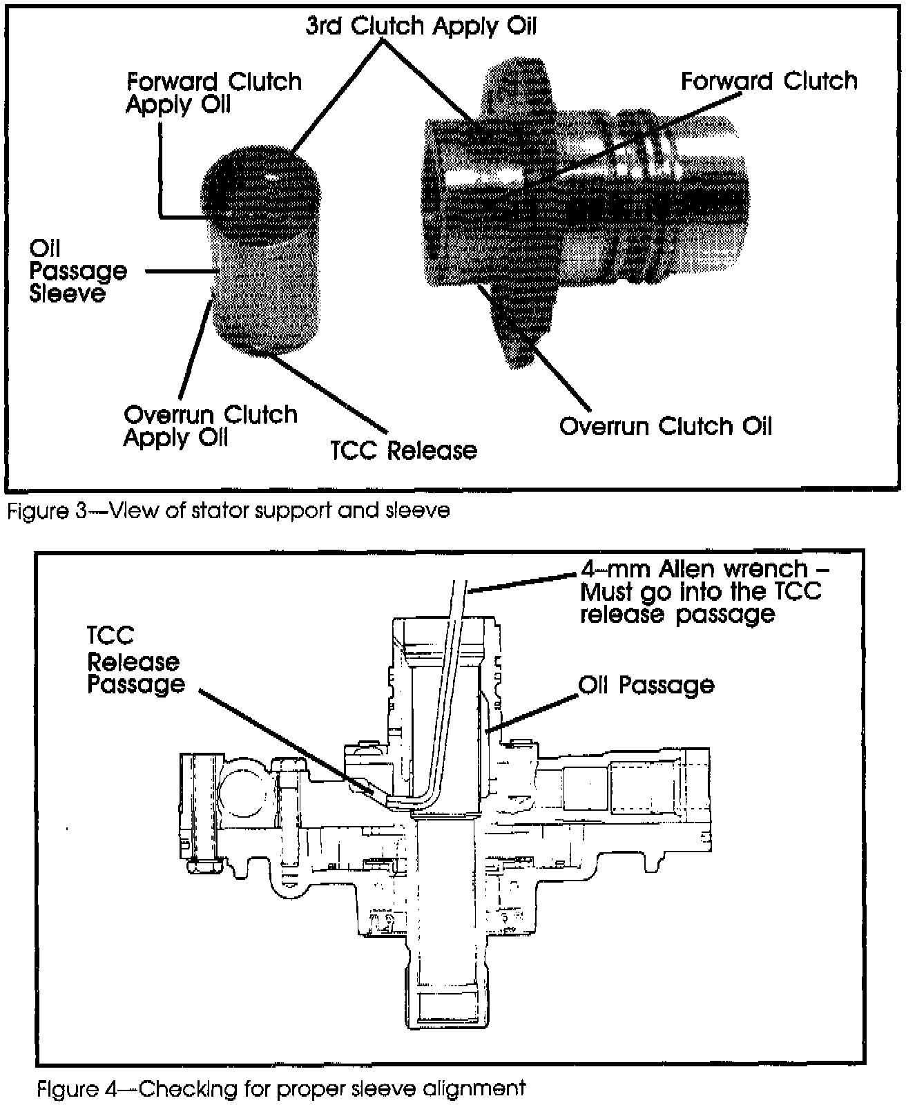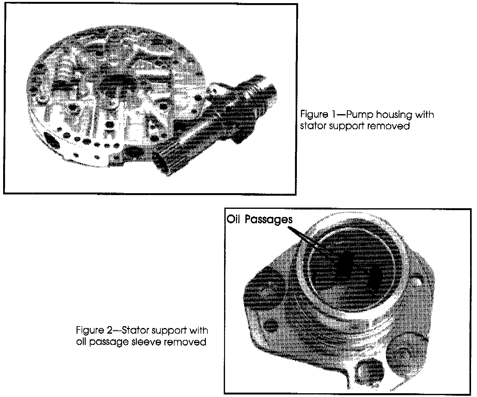 These conditions can be caused by low line pressure or worn internal parts. However, if none of these problems are found, check the stator support for the oil passage sleeve rotating in the support (figures 1 and 2).