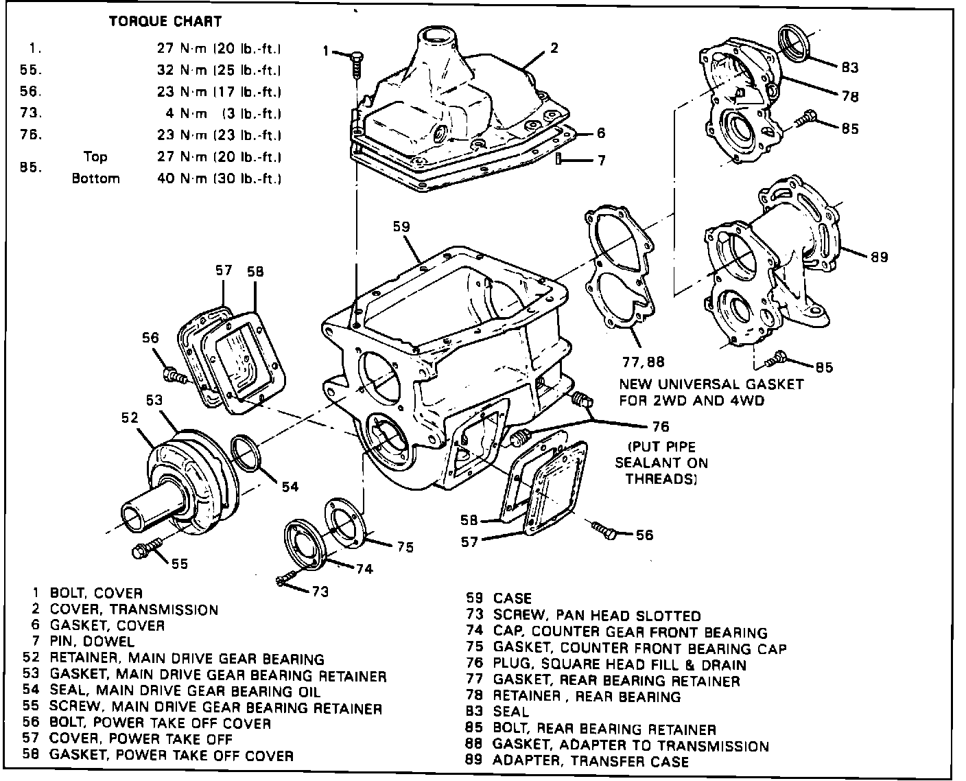 This bulletin covers service information on vehicles equipped with a HM-117 or CH/SM 465 manual transmission (Figure 1) that may have fluid leaks. These fluid leaks should be serviced with new styrene rubber coated cellulose fiber gaskets, insuring flatness of the case mating surfaces and the addition of sealant to specified parts. The new gaskets are for the (top) cover (6), power take off (PTO) covers (58), main drive gear retainer (53), countershaft front bearing cap (75) and a universal 2WD and 4WD rear bearing retainer gasket (77 and 88).