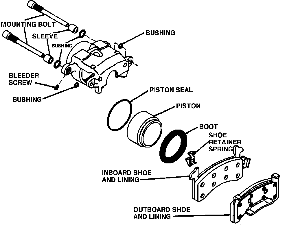 The Delco-Moraine Single Piston Caliper is held in place by two mounting bolts. The caliper assembly, Fig. 1, slides on its mounting surfaces. Upon brake application, hydraulic pressure against the piston forces the inboard pad against the inboard side of the disc. This action causes the caliper assembly to slide until the outboard pad comes into contact with the disc, which in turn creates a slowing or stopping action.