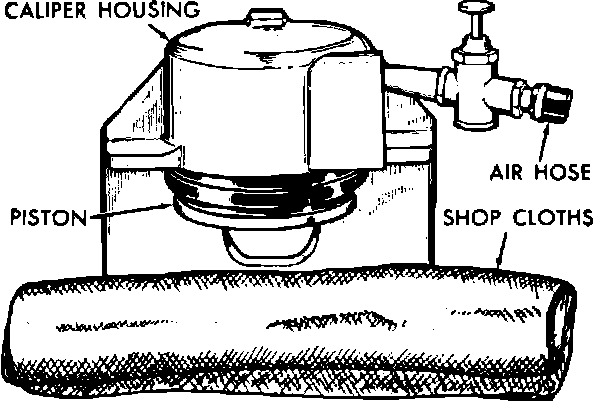 2. Position caliper with shop cloths, Fig. 5, and apply compressed air to fluid inlet port to ease piston from bore. Do not attempt to catch piston or to protect it when applying compressed air, since personal injury is possible.