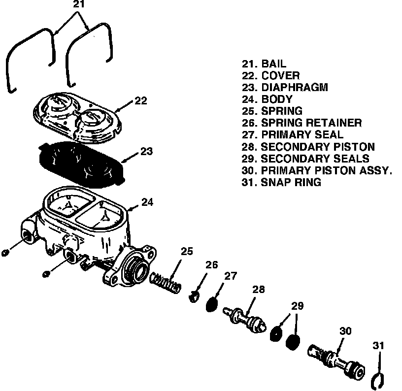 7. Hold master cylinder with open end down, then place secondary piston assembly into bore, with spring seated against end of bore.