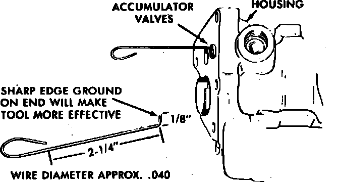 13. If accumulator valve is to be removed, fabricate tool from .040 inch diameter wire as shown in Fig. 6. Remove dump valve by catching tool under pin guide near center of valve, then remove check valve assembly and seat, Fig. 7.