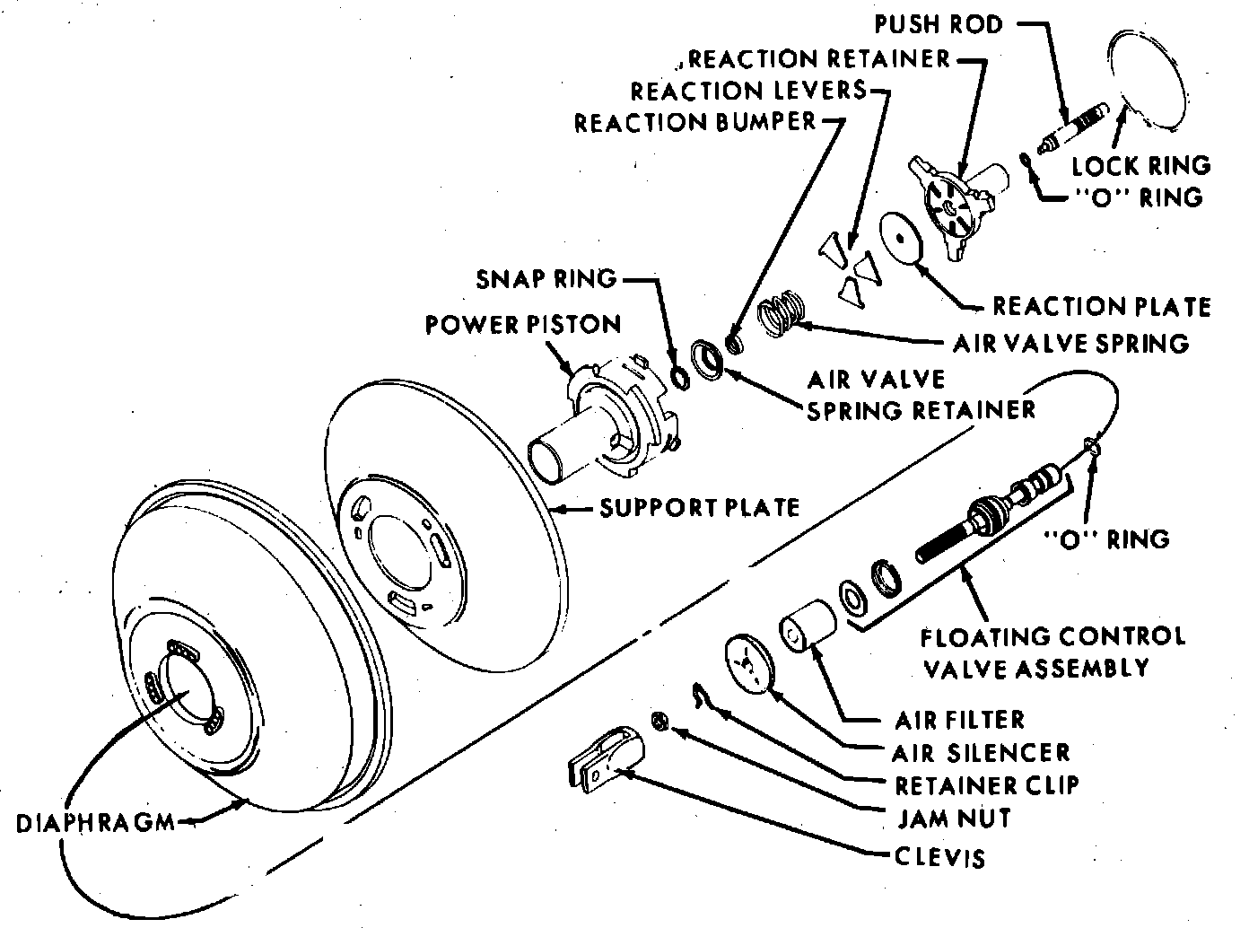 The control valve is made up of an air valve and floating vacuum control valve assembly. The reaction mechanism consists of an hydraulic piston, reaction plate and a series of levers. The valve operating rod, which operates the air valve, projects from the power section and is connected to the brake pedal linkage.