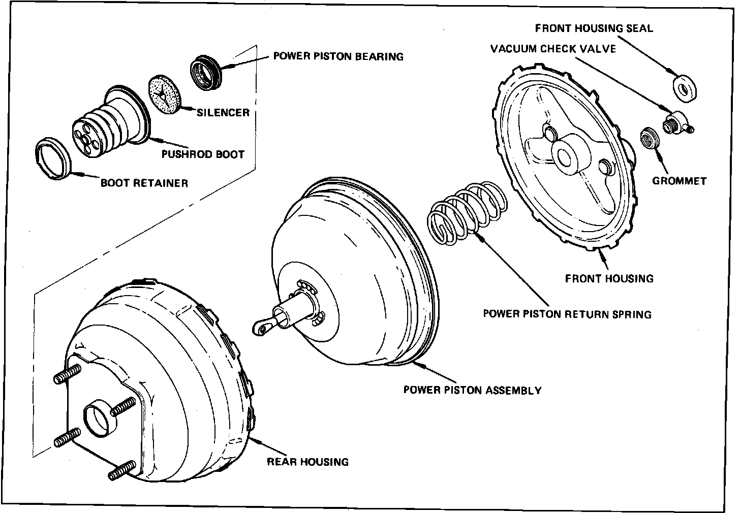 These units, Figs. 3 and 4, have a vacuum power chamber that consists of a front and rear shell, a housing divider, front and rear diaphragm and plate assemblies, an hydraulic pushrod and a diaphragm return spring.
