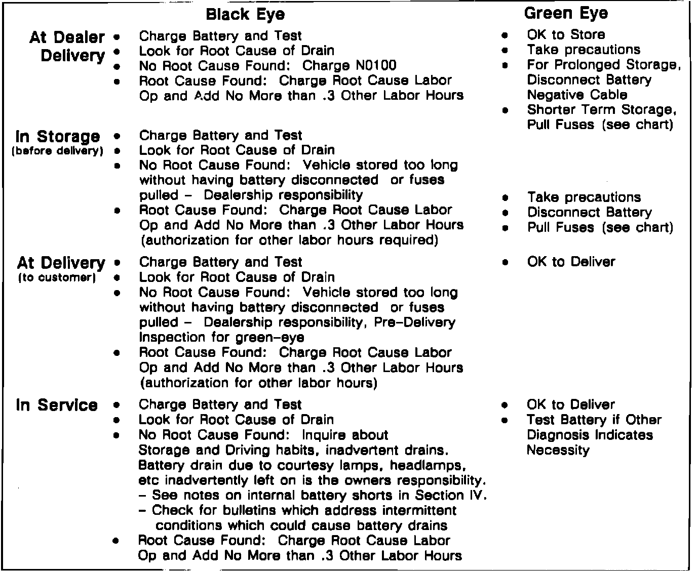 Following proper testing and parasitic diagnosis procedures are in the best interests of the dealership in light of Warranty Policies and procedures outlined in DSIB 89-I-9. This bulletin states that Labor Operation N0100, "Battery charge and test", is to be used only in case of new vehicles received from the carrier with a discharged or "Dark Eye" battery. Recharge and/or replacement of new vehicle batteries on unsold cars in dealer inventory are the responsibility of the dealership.
