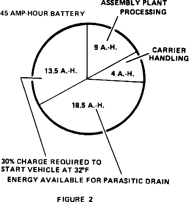 Figure 2 shows a typical amount of current used in getting a vehicle built and delivered to the dealer, how much is available for electrical devices and how much is necessary to start the vehicle. The battery begins to be discharged at the time it is connected. Current is used during plant build, carrier handling, dealer storage and new car preparation. During this entire period, the vehicle is never driven long enough nor at a high enough RPM to bring the battery back up to a full state of charge.