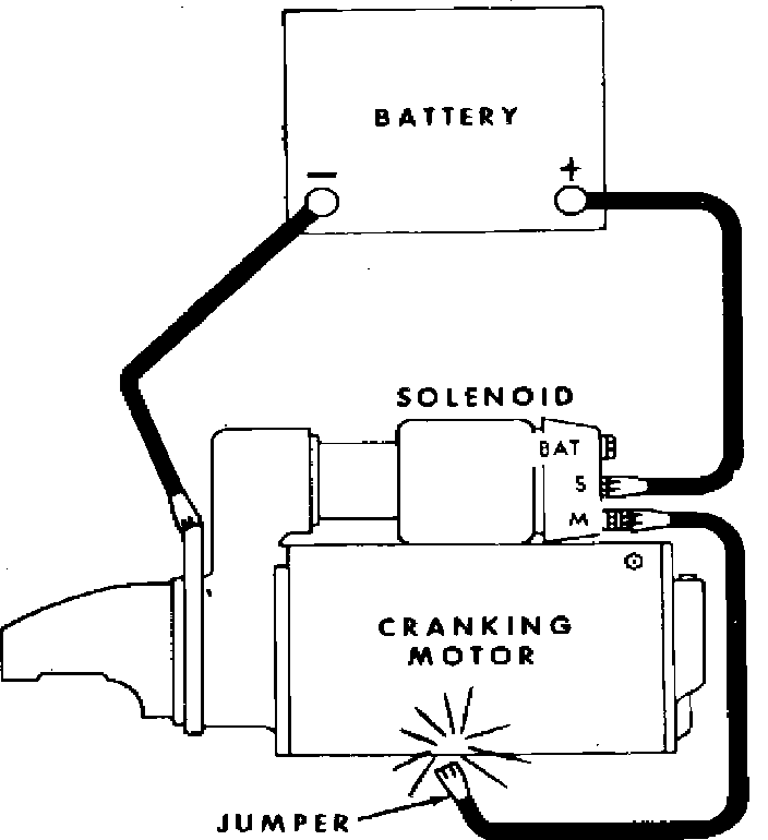 Pinion clearance should be checked after the motor has been disassembled and reassembled. To check, disconnect motor field coil connector from solenoid terminal and insulate end. Connect one battery lead to solenoid switch terminal and the other lead to the solenoid frame, Fig. 8. Using a jumper lead connected to the solenoid motor terminal, momentarily flash the lead to the solenoid frame. This will shift the pinion into the cranking position until the battery is disconnected.