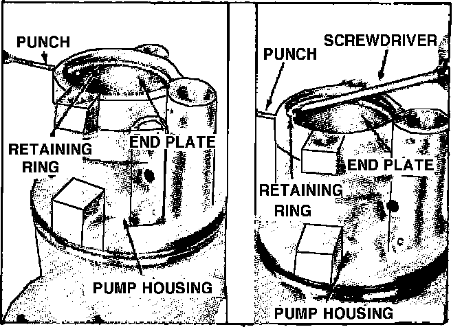 4. Using a small punch, depress end plate retaining ring enough to allow removal from groove. Use the 1/8 inch diameter hole in housing, Fig. 2. Then remove retaining ring with screwdriver.