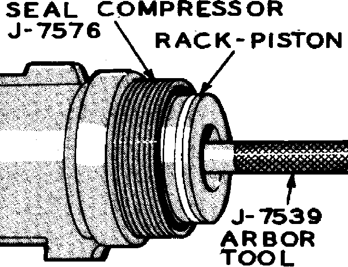 4. Holding a suitable Teflon ring compressor sleeve tightly against shoulder of gear housing, insert rack-piston nut and arbor into housing, holding arbor unit it contacts worm end, Fig. 26.
