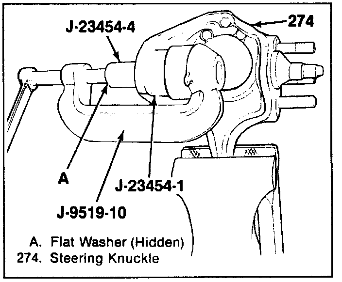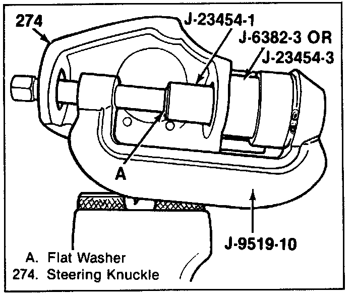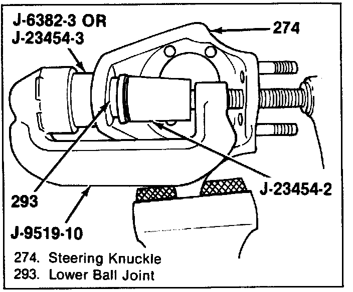 Tools Required: J-9519-1O Ball Joint Fixture, J-23454-1 Lower Ball Joint Spacer, J-23454-3 or J-6382 Upper Ball Joint Spacer, J-23454-4 Upper and Lower Bail Joint Sleeve.