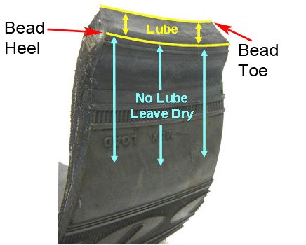 Lubricate the tire as shown in the following illustration. To eliminate wheel slip, the tire beads should normally only be lubricated from "heel to toe." Lubricant applied outside the heel to toe zone will cause the tire to have reduced grip on the wheel and increase the likelihood of slippage.