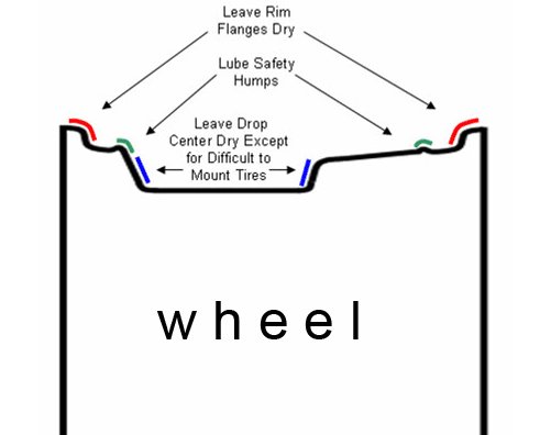 The following diagram illustrates the recommended lubrication of the wheel to prevent wheel slip. Lubricate the safety humps. Leave the rim flanges dry. Lubricate the drop center area only for difficult to mount tires.