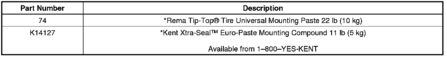 Suitable paste lubricants include Rema Tip-Top(R) Tire Universal Mounting Paste if available in your area, Kent Xtra-Seal(TM) Euro-Paste Mounting Compound or equivalent. The Kent product is distributed nationally. Contact 1-800-YES-KENT for additional information on this product.