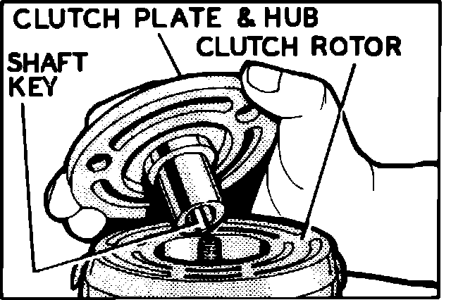 2. With shaft key and keyway aligned, assemble clutch plate and hub on shaft. Clean clutch plate and clutch rotor frictional surfaces before installation. When installing the assembly, do not apply pressure to clutch hub and shaft.